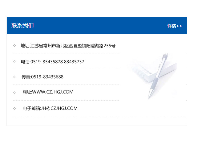 地址:常州市新北區(qū)友邦商務(wù)大廈1幢16、17層  電話(huà):0519-85101652  傳真:0519-85112595  郵編:213022  網(wǎng)址:www.cz-jiayue_cn.59yimin.com  郵箱:xiajifengaa@163.com